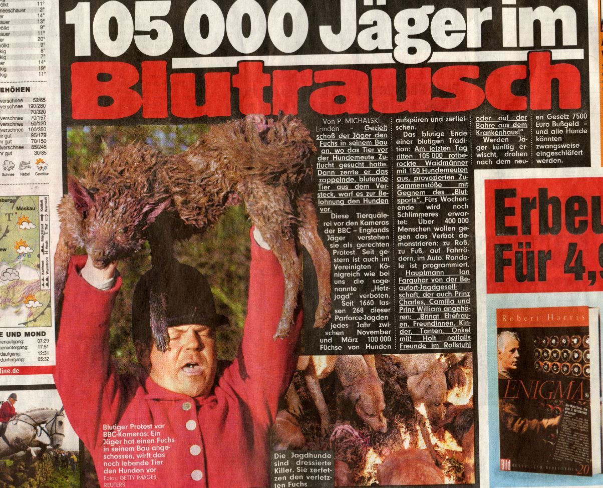 Nachdem immer mehr Menschen die Jägerausreden ( Jägerlatein ) von angeblich notwendiger Regulierung des Wildes mit der Waffe durchschauen, geben es die Jäger in ihren Jagdzeitschriften inzwischen offen zu: Freude am Beutemachen , Lust am Töten , ein angeblich angeborener Jagdtrieb sind die wahre Motivation.